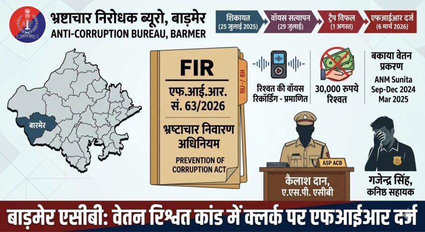 (ब्यूरो रिपोर्ट / बाड़मेर-जयपुर) – बाड़मेर जिले में भ्रष्टाचार निरोधक ब्यूरो (एसीबी) ने बड़ी कार्रवाई करते हुए एक कनिष्ठ सहायक के खिलाफ भ्रष्टाचार निवारण अधिनियम के तहत मामला दर्ज किया । आरोपी क्लर्क ने एक एएनएम का पांच महीने का अटका वेतन बनाने की एवज में 30 हजार रुपये की रिश्वत मांगी थी । ट्रैप की योजना के दिन आरोपी कार्यालय नहीं आया । बाद में विभाग ने उसे पद से हटा दिया । इसके चलते रंगे हाथों पकड़ने की कार्रवाई पूरी नहीं हो सकी । अब वॉयस रिकॉर्डिंग में रिश्वत की मांग प्रमाणित होने पर एफआईआर दर्ज की गई ।