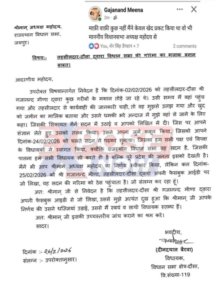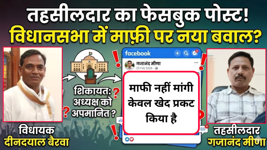 विधायक द्वारा स्पीकर को दी गई शिकायत के अनुसार, 24 फरवरी 2026 को विधानसभा अध्यक्ष ने सदन में तहसीलदार का वह पत्र पढ़कर सुनाया था जिसमें उन्होंने अपना जुर्म कबूल किया था और माफी मांगी थी। सदन में पक्ष और विपक्ष के सभी विधायकों ने अध्यक्ष के इस कदम का स्वागत किया था। लेकिन इसके ठीक अगले दिन यानी 25 फरवरी को तहसीलदार गजानंद मीणा ने अपनी फेसबुक आईडी से एक पोस्ट किया। इस पोस्ट में तहसीलदार ने लिखा, “माफ़ी वाफ़ी कुछ नहीं मैंने केवल खेद प्रकट किया था वो भी माननीय विधानसभा अध्यक्ष महोदय से”।