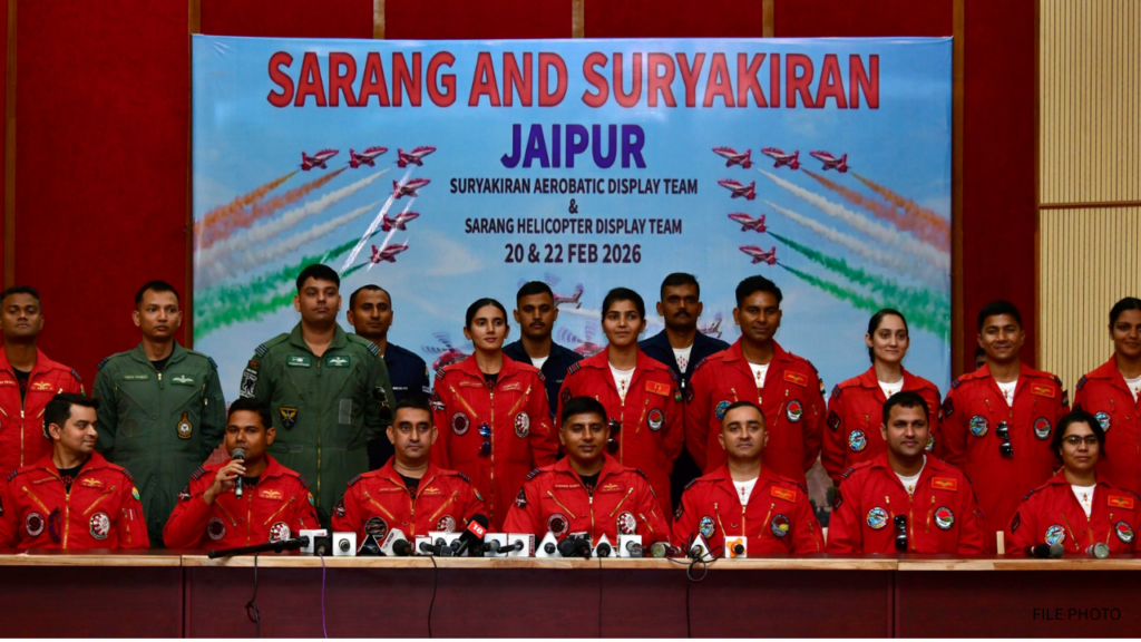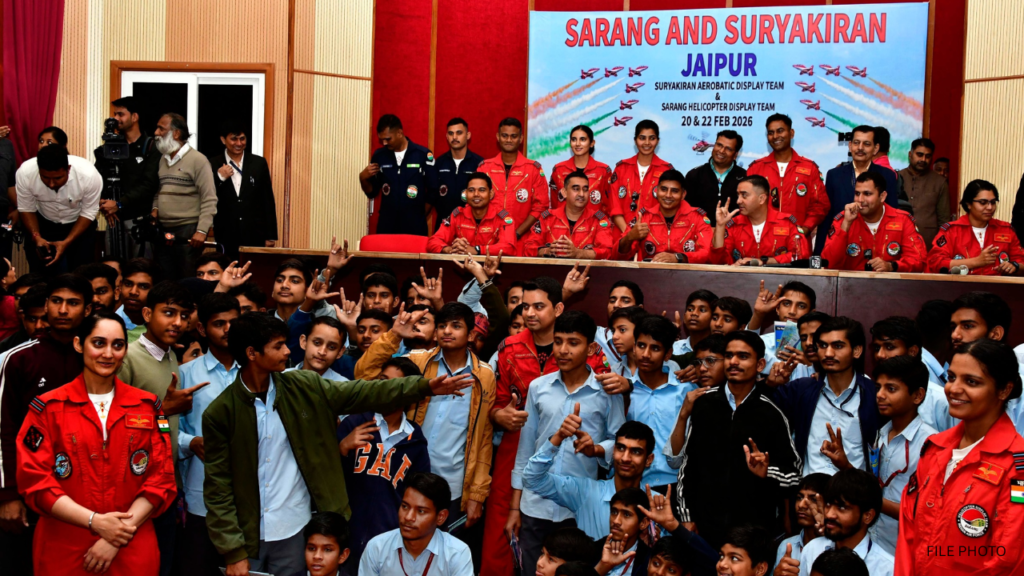 जयपुर: भारतीय वायुसेना के ‘एम्बेसडर्स’ कहे जाने वाली सूर्य किरण एरोबैटिक टीम और सारंग हेलीकॉप्टर डिस्प्ले टीम ने गुरुवार को जयपुर के युवाओं के साथ एक विशेष संवाद कार्यक्रम में हिस्सा लिया। एचसीएम रीपा (HCM RIPA) के भगवत सिंह मेहता सभागार में आयोजित इस कार्यक्रम में एनसीसी कैडेट्स, विभिन्न स्कूलों के छात्र-छात्राएं और मूक-बधिर विद्यार्थी शामिल हुए।