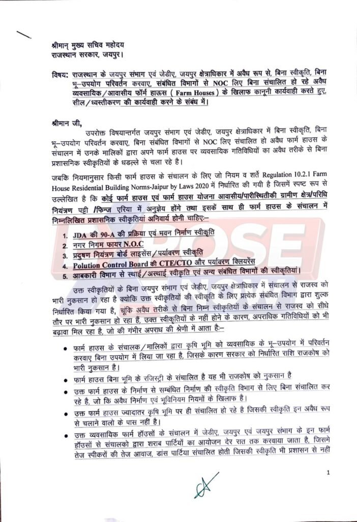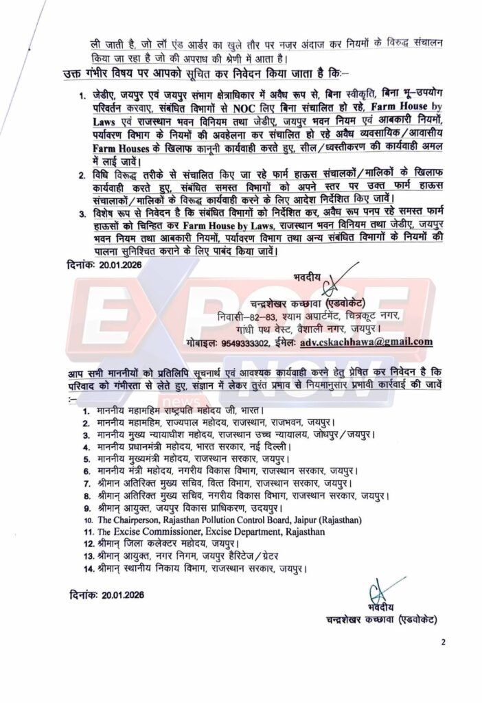 इस पूरे काले कारोबार का पर्दाफाश तब हुआ, जब दिनांक 20.01.2026 को एडवोकेट चन्द्रशेखर कच्छावा ने राजस्थान सरकार के मुख्य सचिव को एक विस्तृत और तथ्यात्मक शिकायती पत्र भेजा ।एडवोकेट कच्छावा ने मुख्य सचिव से जयपुर संभाग और जेडीए क्षेत्राधिकार में चल रहे ऐसे सभी अवैध फार्म हाउसों के खिलाफ सख्त कदम उठाने की अपील की है: