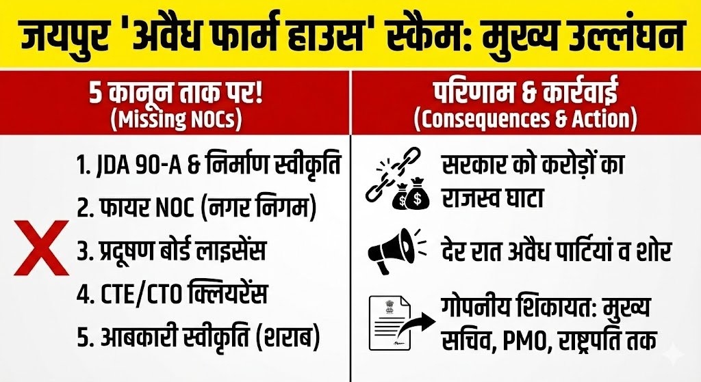अवैध रूप से चल रहे इन फार्म हाउसों ने ‘Farm House Residential Building Norms-Jaipur by Laws 2020’ के नियमों की धज्जियां उड़ा रखी हैं । एक वैध संचालन के लिए जरूरी ये 5 प्रशासनिक स्वीकृतियां इन जगहों से नदारद हैं: