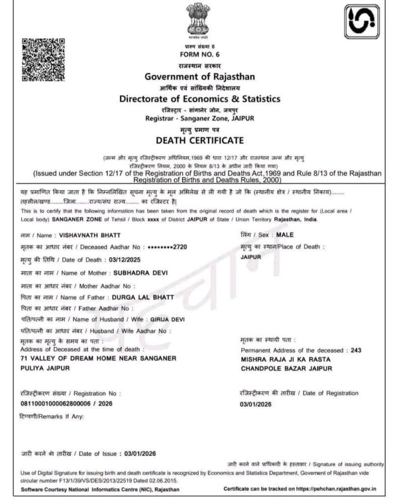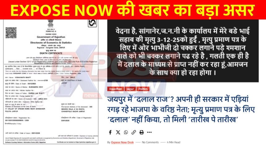 जयपुर। राजधानी जयपुर के नगर निगम ग्रेटर के सांगानेर जोन में व्याप्त भ्रष्टाचार और लापरवाही को लेकर ‘EXPOSE NOW NEWS’ द्वारा प्रमुखता से उठाई गई खबर का बड़ा असर हुआ है। भाजपा के वरिष्ठ नेता और पूर्व प्रवक्ता कैलाश नाथ भट्ट द्वारा अपने भाई के मृत्यु प्रमाण पत्र के लिए सिस्टम की लाचारी और दलाली की पोल खोलने के बाद कुंभकर्णी नींद में सोये निगम प्रशासन में हड़कंप मच गया। खबर प्रकाशित होने और सोशल मीडिया पर मामला गरमाने के बाद नगर निगम प्रशासन ने आनन-फानन में कार्रवाई करते हुए तुरंत मृत्यु प्रमाण पत्र जारी किया।