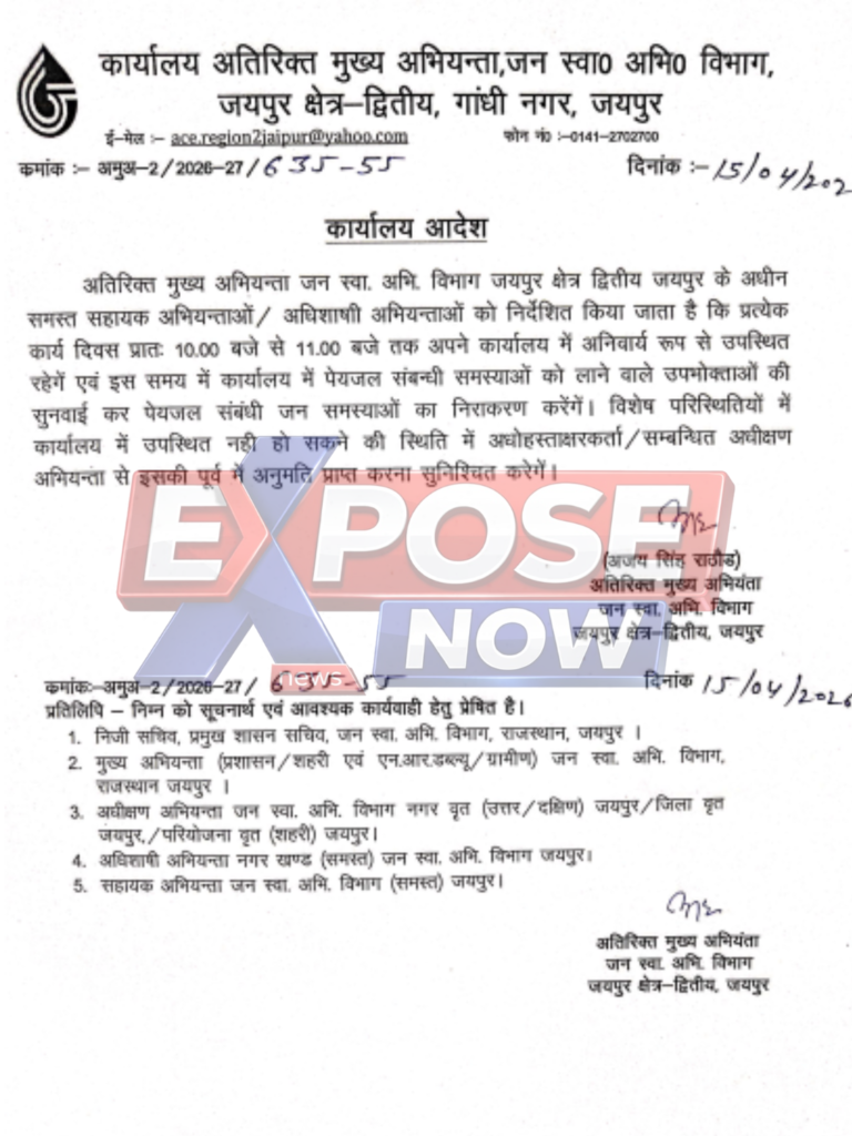 नए आदेश के अनुसार, जयपुर क्षेत्र-द्वितीय के अधीन आने वाले सभी सहायक अभियंताओं (AEN) और अधिशाषी अभियंताओं (XEN) को प्रत्येक कार्य दिवस पर सुबह 10.00 बजे से 11.00 बजे तक अनिवार्य रूप से अपने कार्यालय में उपस्थित रहना होगा। कार्यालय में पेयजल संबंधी समस्याओं को लेकर आने वाले उपभोक्ताओं की सीधी सुनवाई करना और उनका त्वरित निराकरण करना।