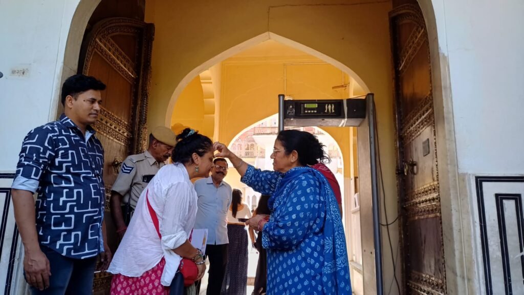 राजस्थान की राजधानी जयपुर में आज ‘विश्व धरोहर दिवस’ के अवसर पर पर्यटकों का बेहद खास और पारंपरिक अंदाज में स्वागत किया गया। गर्मी की तपिश के बावजूद देशी और विदेशी सैलानियों के उत्साह में कोई कमी नहीं दिखी। विश्व प्रसिद्ध हवा महल पर आने वाले हर पर्यटक का हवा महल की अधीक्षक सरोजिनी चंचलानी ने तिलक लगाकर अभिनंदन किया जिससे अभिभूत होकर विदेशी मेहमानों ने भी राजस्थानी संस्कृति की जमकर प्रशंसा की।