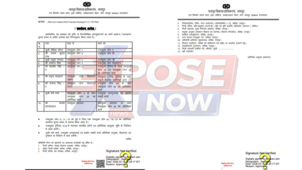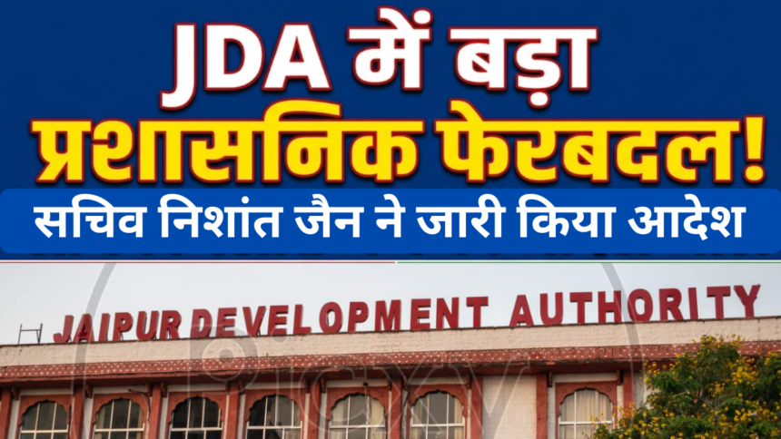 जयपुर: जयपुर विकास प्राधिकरण (JDA) में बुधवार को प्रशासनिक एवं व्यवस्था की दृष्टि से बड़ा फेरबदल किया गया है। जविप्रा सचिव निशांत जैन द्वारा जारी कार्यालय आदेश के तहत कई उपायुक्तों (Deputy Commissioners) के कार्यक्षेत्र में बदलाव करते हुए उन्हें नई जिम्मेदारियां सौंपी गई हैं। यह आदेश तुरंत प्रभाव से लागू कर दिए गए हैं।