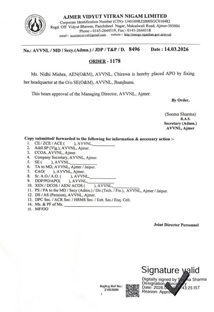 चिड़ावा/झुंझुनूं। अजमेर विद्युत वितरण निगम लिमिटेड (AVVNL) ने चिड़ावा में तैनात सहायक अभियंता (AEN) निधि मिश्रा के खिलाफ कड़ा प्रशासनिक कदम उठाया है। निगम प्रशासन ने मामले का संज्ञान लेते हुए एक ताजा आदेश जारी कर उन्हें तत्काल प्रभाव से एपीओ (Awaiting Posting Orders) कर दिया है। इस आदेश के साथ ही अब उनका मुख्यालय झुंझुनूं स्थित अधीक्षण अभियंता (SE) कार्यालय में निर्धारित कर दिया गया है।