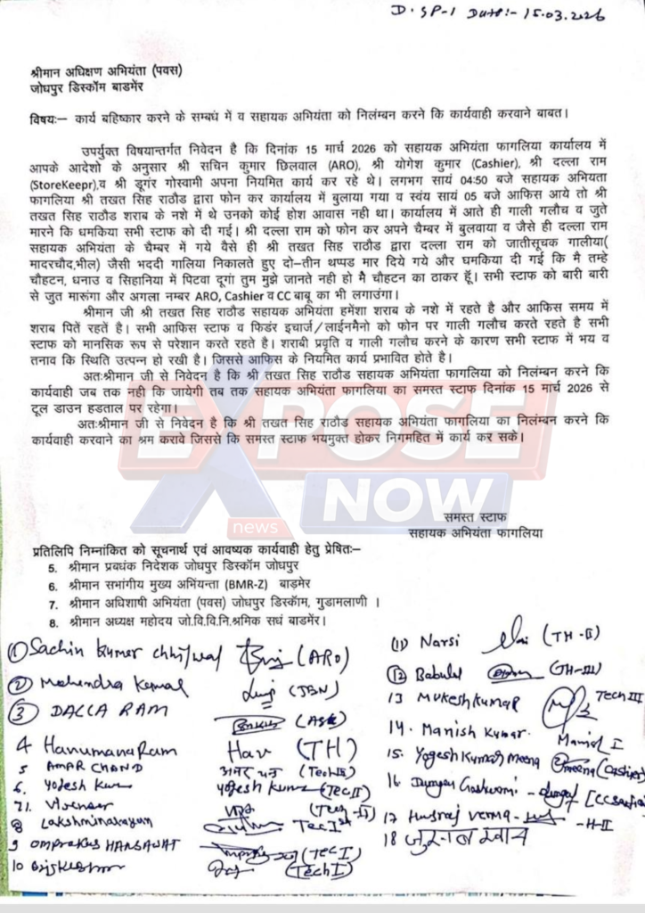 बाड़मेर: जोधपुर डिस्कॉम के फागलिया (बाड़मेर) कार्यालय में रविवार को उस वक्त तनावपूर्ण स्थिति उत्पन्न हो गई, जब सहायक अभियंता (AEN) तखत सिंह राठौड़ पर शराब के नशे में अपने ही स्टाफ के साथ मारपीट, जातिसूचक गाली-गलौज और अभद्र व्यवहार करने के गंभीर आरोप लगे। इस शर्मनाक घटना से आक्रोशित होकर कार्यालय के समस्त तकनीकी और मंत्रालयिक कर्मचारियों ने अनिश्चितकालीन ‘टूल डाउन’ (कार्य बहिष्कार) हड़ताल की घोषणा कर दी है, जिससे क्षेत्र की बिजली व्यवस्था प्रभावित होने की आशंका है।