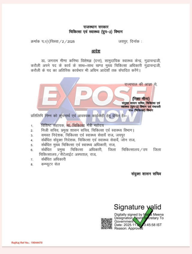 - “पता नहीं यह अर्दली कब से खेल कर रहा है”: सूत्रों के मुताबिक, EXPOSE NOW की खबर के बाद यह मामला मुख्यमंत्री भजनलाल शर्मा और सीएमओ (CMO) के जरिए सीधे चिकित्सा मंत्री गजेंद्र सिंह खींवसर तक पहुंचा। मंत्री ने गहरी नाराजगी जताते हुए कहा, “पता नहीं यह अर्दली कब से मुझे जानकारी दिए बिना अधिकारियों पर दबाव डालकर सीधे चहेतों के आदेश करवा रहा है।”