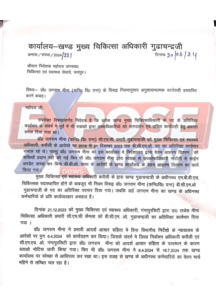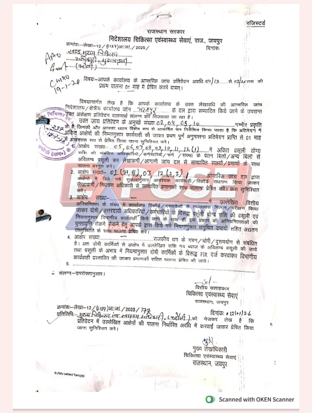 करौली- करौली चिकित्सा विभाग में ‘EXPOSE NOW’ द्वारा उजागर किए गए ‘ऑपरेशन महाघोटाला’ (शीर्षक: भ्रष्टाचार का दीमक जिसने नियमों को कुचलकर सरकारी खजाने में लगाई करीब 33 लाख रुपए की सेंध) का जबरदस्त असर देखने को मिला है। खबर प्रकाशित होने के बाद निदेशालय चिकित्सा एवं स्वास्थ्य सेवाएं, राजस्थान ने तुरंत एक्शन लेते हुए करौली सीएमएचओ (CMHO) को सख्त पत्र जारी किया है। निदेशालय ने घोटाले की जांच करवाकर संबंधित दोषी अधिकारियों और कार्मिकों से गबन की गई राशि की वसूली करने, सख्त विभागीय कार्रवाई करने और गबन की राशि नही चुकाने पर पुलिस में एफआईआर (FIR) दर्ज कराकर पालना रिपोर्ट भेजने के आदेश दिए हैं।