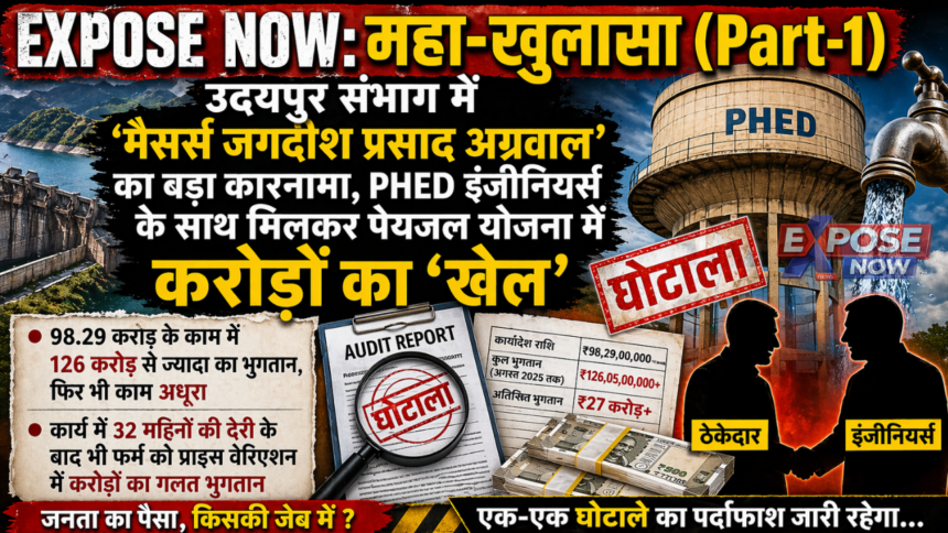 जयपुर/उदयपुर। जहां एक ओर सरकार हर घर नल से जल पहुंचाने का दावा कर रही है, वहीं भ्रष्टाचार की दीमक योजनाओं की जड़ों को खोखला कर रही है। राजस्थान के उदयपुर संभाग से भ्रष्टाचार की एक ऐसी सनसनीखेज तस्वीर सामने आई है, जिसने जल जीवन मिशन की पारदर्शिता पर कालिख पोत दी है। संभाग की सबसे पावरफुल मानी जाने वाली ठेकेदार कंपनी ‘मैसर्स जगदीश प्रसाद अग्रवाल’ (संयुक्त साहशी फर्म) ने जन स्वास्थ्य अभियांत्रिकी विभाग (PHED) के इंजीनियर्स के साथ मिलीभगत कर सोम कमला-अम्बा बांध पेयजल परियोजना में नियमों को ताक पर रखकर जनता की गाढ़ी कमाई के करोड़ों रुपये पानी की तरह बहा दिए गए, बल्कि सरकारी खजाने को करोड़ों रूपए का चूना भी लगाया है। जिस प्रोजेक्ट की लागत 98.29 करोड़ थी, उसका फर्म को 126 करोड़ से ज्यादा का भुगतान कर दिया। बड़ा सवाल ये है कि 32 महिनों की देरी से पूरा होने वाले इस प्रोजेक्ट में अभी भी कई कार्य अधूरे पड़े है।