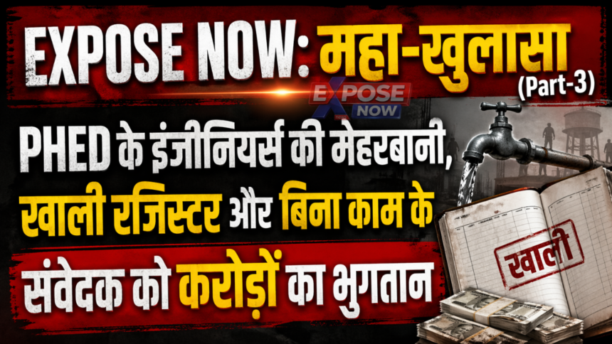 उदयपुर/जयपुर। ‘EXPOSE NOW’ की विशेष पड़ताल में जल जीवन मिशन (JJM) के तहत राजस्थान के उदयपुर संभाग में चल रहे एक और बड़े घोटाले का कच्चा चिट्ठा सामने आया है। 98.29 करोड़ रुपये के एक ही बड़े प्रोजेक्ट में भ्रष्टाचार के एक दर्जन से ज्यादा सुराख मिले हैं। जहाँ एक तरफ सोम-कमला-अम्बा बांध परियोजना में देरी और अनियमितताओं के आरोप हैं, वहीं उदयपुर परियोजना खंड-द्वितीय के अधिकारियों ने संवेदक पर ऐसी ‘अंधी’ मेहरबानी दिखाई कि बिना काम हुए ही 2.83 करोड़ का भुगतान कर दिया।