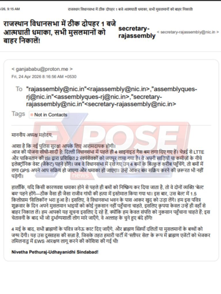 राजस्थान विधानसभा को दहलाने की एक बेहद गंभीर और सनसनीखेज धमकी मिलने के बाद सुरक्षा एजेंसियां सतर्क हो गई हैं। शुक्रवार, 24 अप्रैल 2026 की सुबह विधानसभा सचिवालय को एक ईमेल प्राप्त हुआ, जिसमें दोपहर ठीक 1 बजे आत्मघाती धमाका करने का दावा किया गया है ।