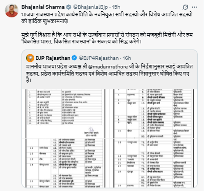 राजस्थान भाजपा में मदन राठौड़ के प्रदेशाध्यक्ष बनने के बाद बहुप्रतीक्षित प्रदेश कार्यसमिति की घोषणा कर दी गई है। प्रदेश महामंत्री श्रवण सिंह बगड़ी द्वारा जारी इस सूची में राजनीतिक संतुलन और वरिष्ठता का विशेष ध्यान रखा गया है। कुल 154 सदस्यों वाली इस नई टीम में मुख्यमंत्री भजनलाल शर्मा से लेकर पूर्व मुख्यमंत्री वसुंधरा राजे तक को शामिल कर पार्टी ने ‘ऑल इज वेल’ और एकजुटता का कड़ा संदेश दिया है। इस सूची में सामाजिक समीकरणों के साथ-साथ 20 महिलाओं को भी प्रतिनिधित्व देकर महिला सशक्तिकरण पर जोर दिया गया है।