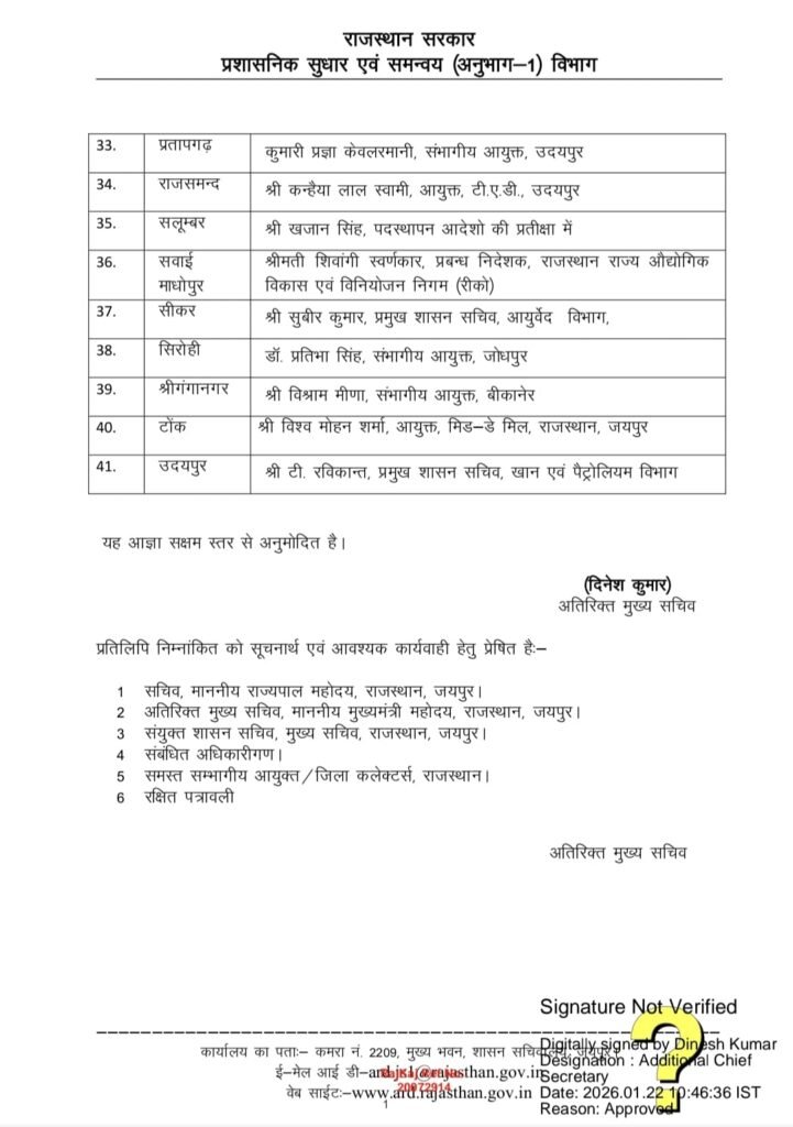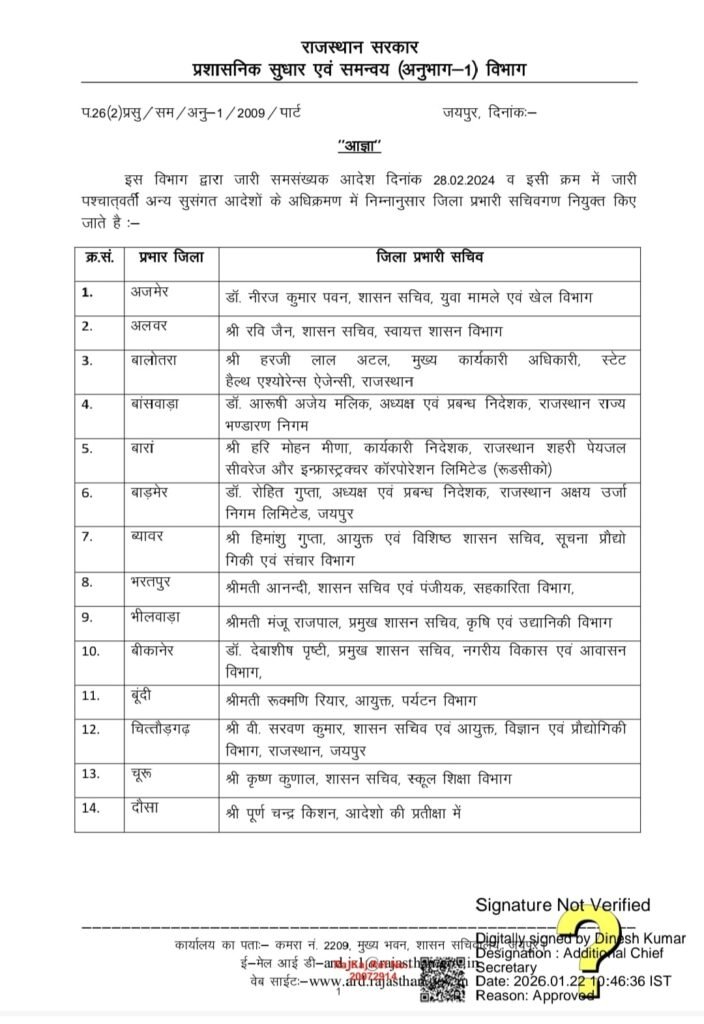 जयपुर, राजस्थान सरकार ने गणतंत्र दिवस (26 जनवरी) समारोह से पहले राज्य की प्रशासनिक व्यवस्था को मजबूत करने के लिए बड़ा कदम उठाया है। प्रशासनिक सुधार विभाग (ARD) द्वारा जारी नवीनतम आदेश के अनुसार, प्रदेश के 41 जिलों में नए प्रभारी सचिवों की नियुक्ति की गई है। इस फेरबदल में कई वरिष्ठ भारतीय प्रशासनिक सेवा (IAS) अधिकारियों को महत्वपूर्ण जिलों की जिम्मेदारी सौंपी गई है।
