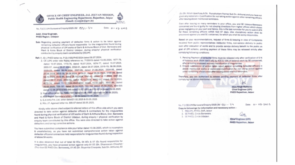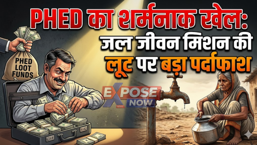 जयपुर। राजस्थान में ‘हर घर जल’ पहुंचाने के संकल्प वाले जल जीवन मिशन (JJM) में भ्रष्टाचार की जड़ें कितनी गहरी हैं, इसका सनसनीखेज खुलासा विभाग के ही अधिकारियों के पत्रों से हो रहा है। जलदाय विभाग के कुछ ईमानदार अधिकारी इन फर्जीवाड़ा व भ्रष्टाचार करने वाले अधिकारियों पर सख्त कार्रवाई करना चाहते हैं, लेकिन इसी पीएचईडी (PHED) के कुछ आलाधिकारी और मंत्रालय के कुछ अधिकारी इन घोटालेबाजों के लिए 2 साल से ‘सुरक्षा कवच’ बनकर बचाने में जुटे हुए है। इसी का नतीजा है कि करोड़ों का भ्रष्टाचार करने वाले इन 13 इंजीनियर्स व ठेका कंपनियों के खिलाफ आज तक कोई कार्रवाई नहीं हुई। EXPOSE NOW के पास मौजूद दस्तावेज़ों से साफ है कि उदयपुर और बांसवाड़ा में हुए करोड़ों के घोटाले में बड़े चेहरों को बचाने के लिए विभाग के भीतर ही एक संगठित खेल चल रहा है। उदयपुर संभाग में करोड़ों के खेल और दोषी अधिकारियों को बचाने की कवायद पर पेश है EXPOSE NOW की विशेष रिपोर्ट-