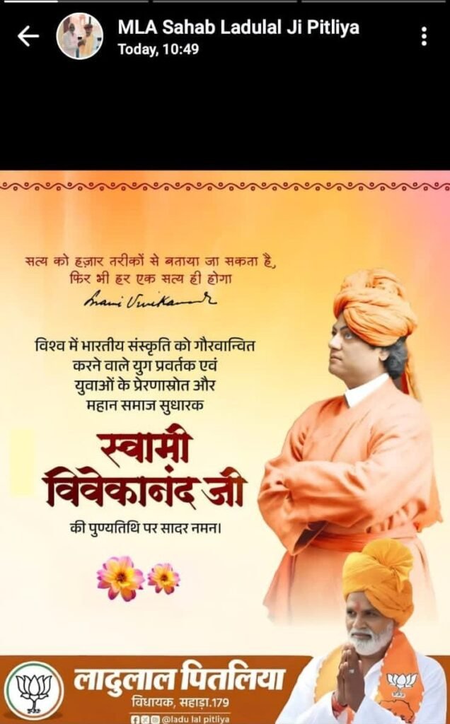 आज पूरे विश्व में युवाओं के प्रेरणास्रोत स्वामी विवेकानंद की जयंती मनाई जा रही है। इस अवसर पर विधायक लादू लाल पितलिया ने अपने सोशल मीडिया हैंडल से स्वामी विवेकानंद को नमन करते हुए एक पोस्ट साझा की। लेकिन, जयंती (जन्म दिवस) के अवसर पर शुभकामना देने के बजाय विधायक ने ‘पुण्यतिथि पर सादर नमन’ वाली फोटो और संदेश पोस्ट कर दिया।