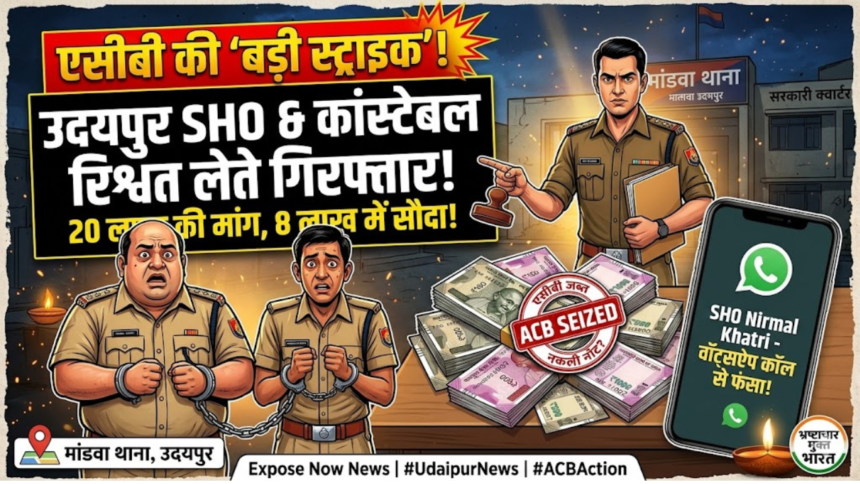विशेष संवाददाता राजस्थान भ्रष्टाचार निरोधक ब्यूरो (ACB) की उदयपुर इंटेलिजेंस यूनिट ने बुधवार को एक बड़ी कार्रवाई करते हुए मांडवा पुलिस थाने के थानाधिकारी (SHO) और एक कांस्टेबल को भारी रिश्वत राशि के साथ गिरफ्तार किया है। भ्रष्टाचार के खिलाफ इस बड़ी स्ट्राइक ने महकमे में हड़कंप मचा दिया है।
