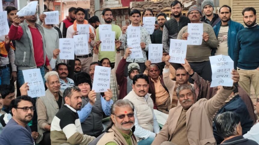 करौली, एक तरफ जहाँ देशभर में गणतंत्र दिवस का जश्न मनाया जा रहा था, वहीं करौली के मंडरायल कस्बे के झंडा चौक पर UGC बिल को लेकर सामान्य वर्ग के लोगों ने तीखा आक्रोश व्यक्त किया। आयोजित महापंचायत में वक्ताओं ने केंद्र सरकार की नीतियों की आलोचना की और ‘मोदी सरकार मुर्दाबाद’ के नारे लगाते हुए इस बिल को ‘काला कानून’ करार दिया।
