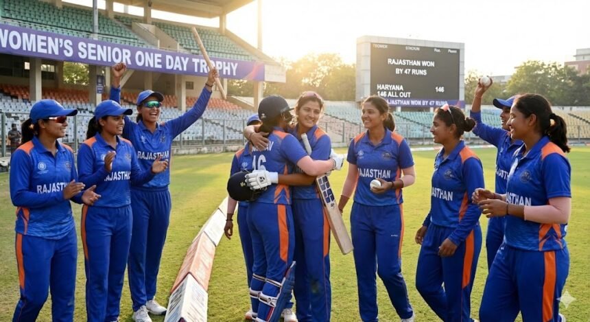 वडोदरा के मैदान पर खेली जा रही वीमेन सीनियर एक दिवसीय ट्रॉफी में आज राजस्थान की महिला टीम ने शानदार प्रदर्शन करते हुए हरियाणा को 47 रनों के बड़े अंतर से हरा दिया। राजस्थान की इस जीत में जहाँ तनूजा वैष्णव ने बल्ले से जौहर दिखाया, वहीं गेंदबाजों ने हरियाणा की टीम को टिकने का मौका नहीं दिया।